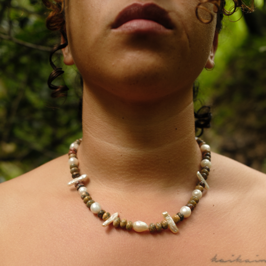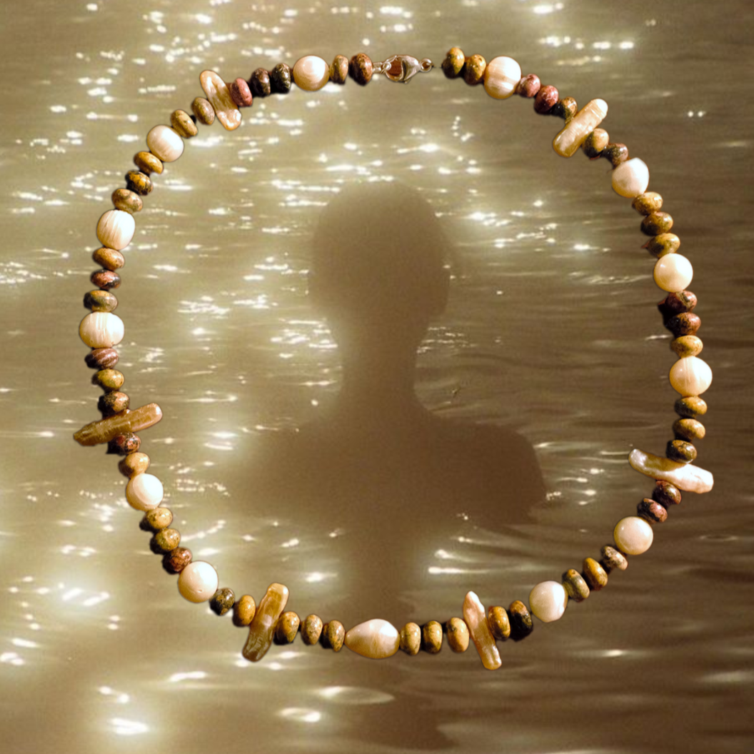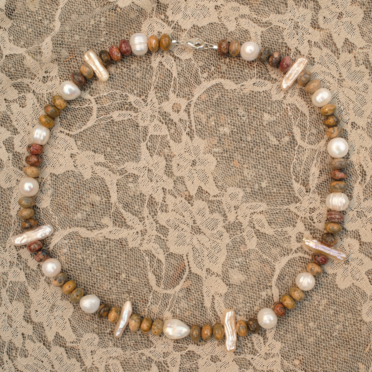 freshwater pearls, biwa pearls, peach keshi pearls, jasper, sterling silver hardware
